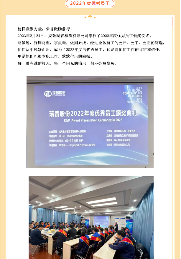 董事長對各部門、子公司負責人的2022年度總結(jié)及2023年度工作規(guī)劃進行分析,對大家疫情期間的工作予以肯定,并對其薄弱與不足之處提出改進意見。2023年公司將圍繞開拓新市場、項目管理制度、事業(yè)部智能化制造、員工工作能力、公司管理制度等方面進行提升。努力為員工提供更好的福利待遇,為客戶提供更優(yōu)質(zhì)的服務,為實現(xiàn)瑞普成為全球橡塑零部件核心供應商的企業(yè)愿景而不懈努力!